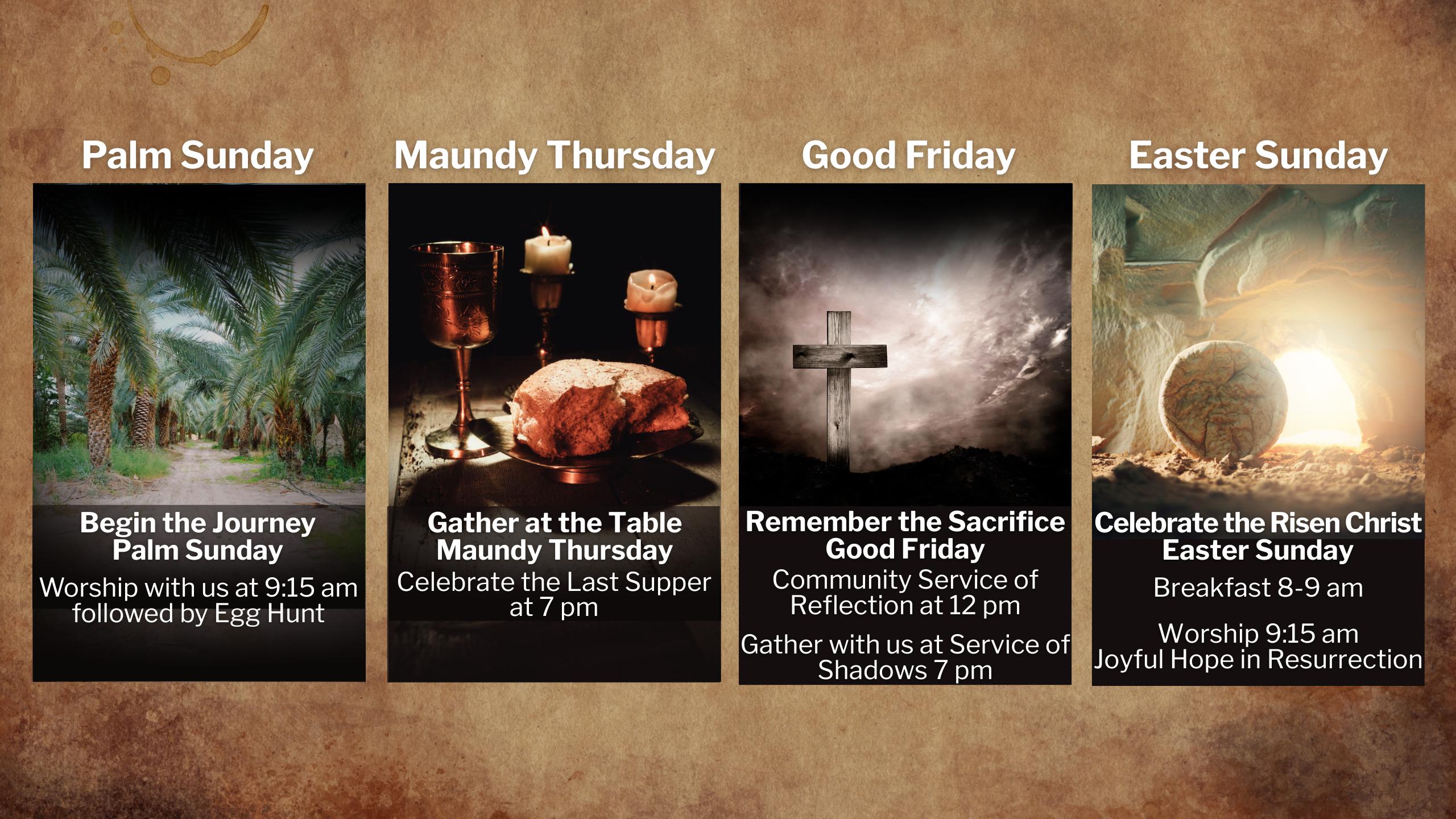 Join us as we Journey from Palm Sunday to the Joy of Easter Morning.